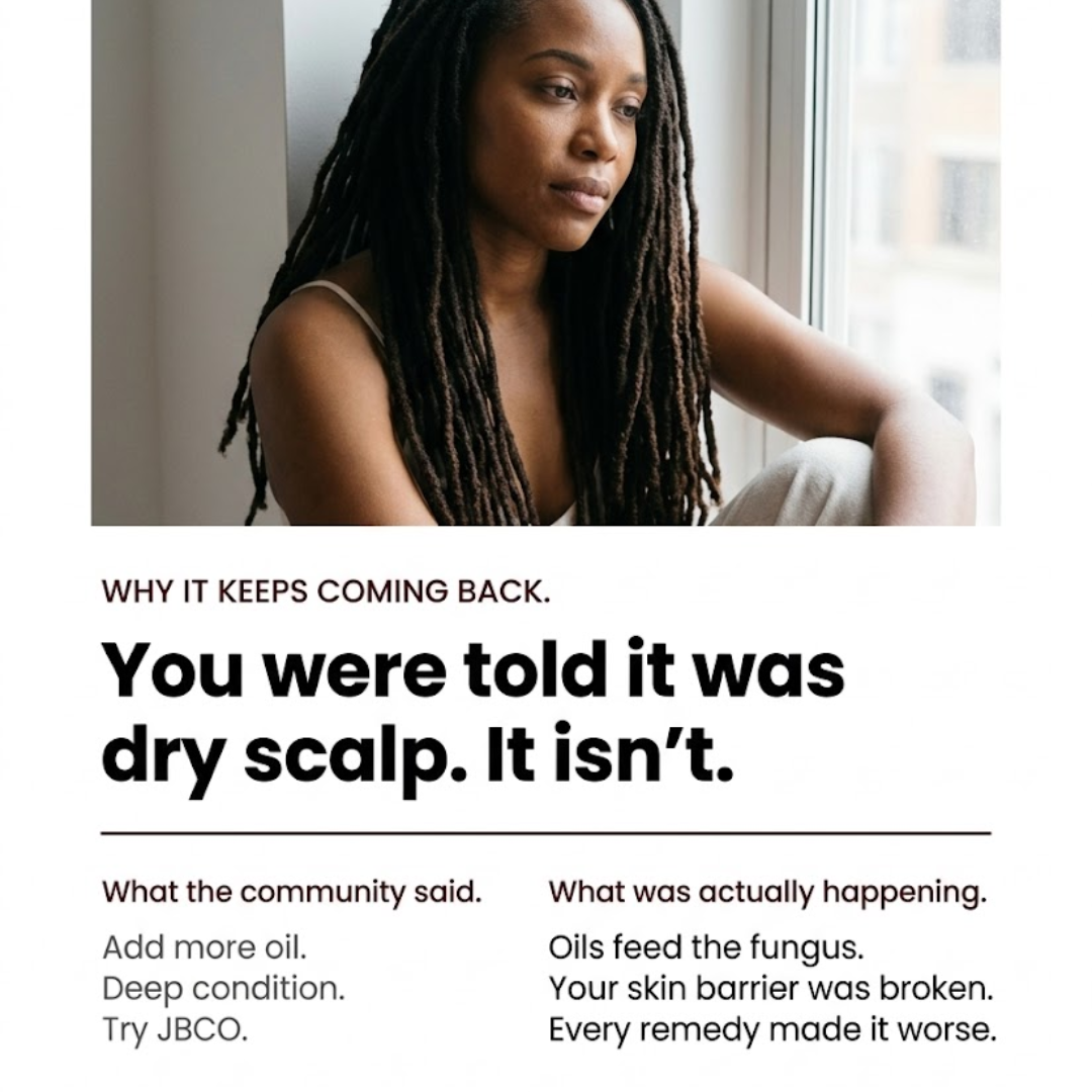 Every oil, every deep condition, every antifungal shampoo that stripped your hair — none of it fixed the real problem.