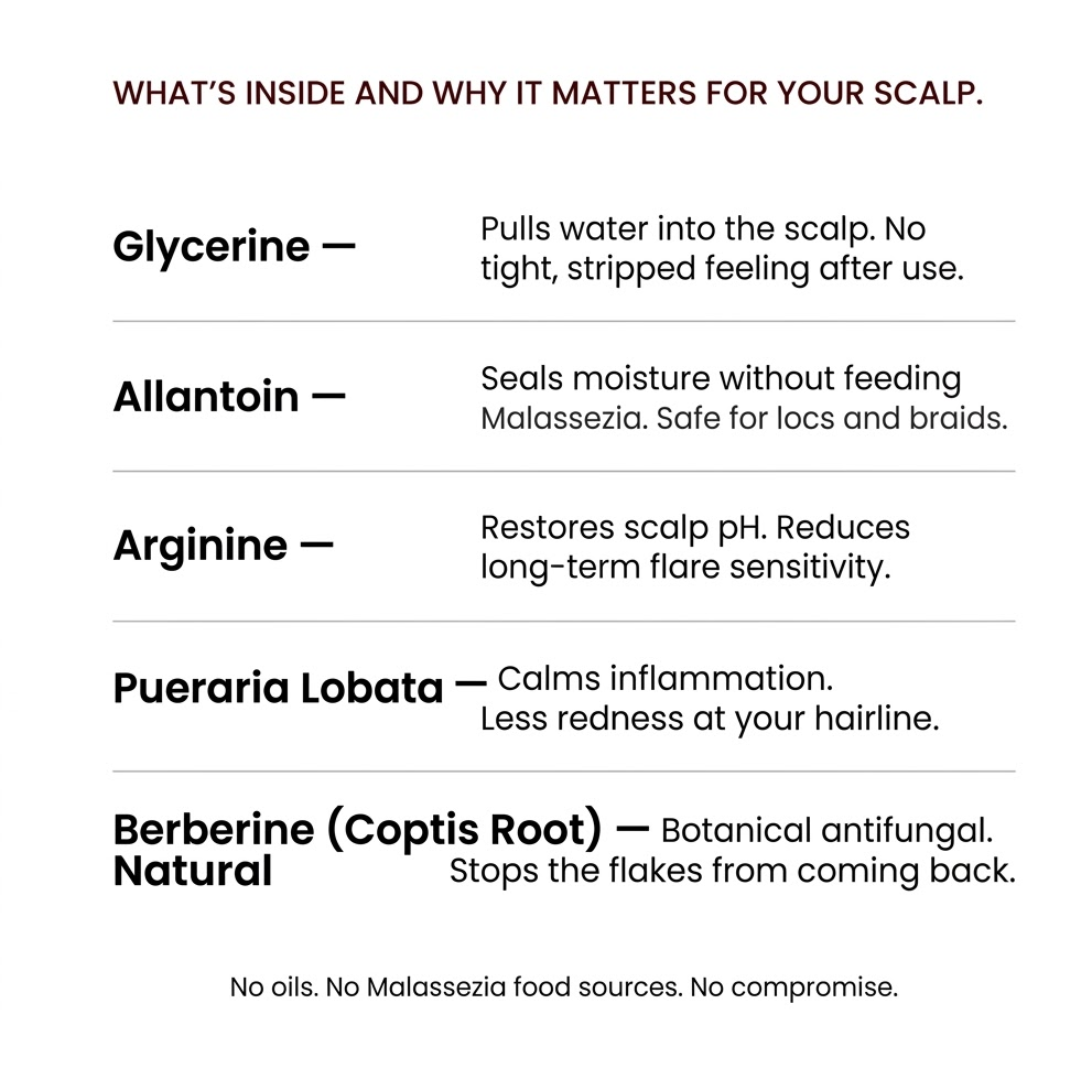 Allantoin seals moisture into your scalp and does one thing no other moisturizer in the natural hair space can claim: it does not feed Malassezia.